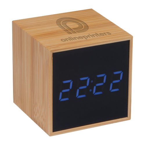 - horloge de table élégante avec boîtier en bambou, écran noir et affichage LED bleu